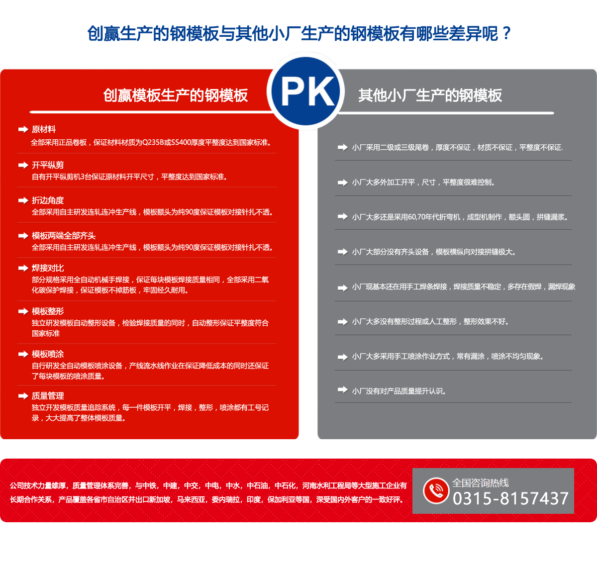 唐山創(chuàng)贏模板有限公司(原唐山豐南雙贏金屬結(jié)構(gòu)廠)始建于一九九七年,是具規(guī)模實(shí)力的組合模板生產(chǎn)企業(yè),公司自行設(shè)計(jì)制造的十二條上卷,連軋,連沖,整形,機(jī)械人焊接,調(diào)直,噴漆,打包鋼模板生產(chǎn),實(shí)現(xiàn)了自動(dòng)化一條龍生產(chǎn),品質(zhì)優(yōu),效率高,規(guī)格型號(hào)為:寬度100-1200mm, 長度300-3000mm, 板厚1.8-4.0mm。 年產(chǎn)量可達(dá)200萬平方米,公司創(chuàng)新研制的輕型鋼框組合快拆鋼模板體系,是傳統(tǒng)組合小鋼模升級(jí)換代產(chǎn)品,可滿足房建,地下管廊,涵洞,公路,鐵路及各類施工企業(yè)的需要,輕型鋼框組合快拆鋼模板體系介紹及應(yīng)用,已在2017年《施工技術(shù)》雜志及《模板腳手架行業(yè)協(xié)會(huì)》雜志發(fā)表,詳情請(qǐng)查閱公司網(wǎng)站。 公司生產(chǎn)的噴漆鋼跳板,鍍鋅鋼跳板,采用連軋一次沖孔,承載力大,孔距均勻,外形美觀,年產(chǎn)量可達(dá)50萬塊,公司獨(dú)創(chuàng)的C型鋼生產(chǎn)線,以其產(chǎn)量高,強(qiáng)度大,成本低,交活迅速,在同行業(yè)占有較大優(yōu)勢(shì),可與C型鋼廠家及各類施工企業(yè)合作共贏.